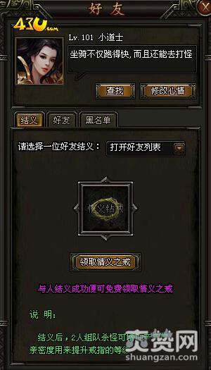 首先43u《铁血皇城》超变版中要结义的2人必须加为好友,双方等级达到80级,一方发出结义请求,另一方同意后便视为结义成功!而且只要玩家与玩家结义成功便可领取(情义之戒),可在好友面板领取。