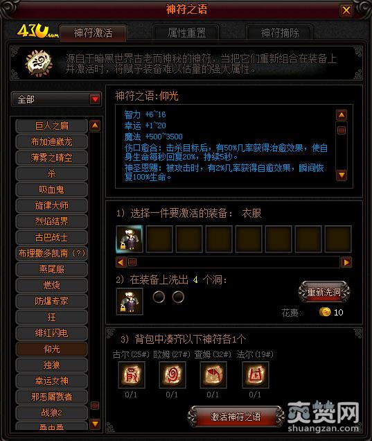 43u《猎魔》中每一件装备在掉落时,都会附带一定的神符洞,将神符按照一定的顺序镶嵌上去,就可以激活神符之语。神符洞数不符时,可以通过重洗获得新的洞数。神符分为1-33号,神符之语越强,需要的神符越高级。