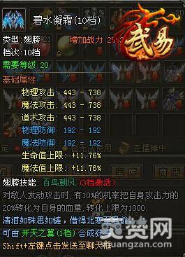 923yx《武易》中的翅膀共有基础属性七条,分别是物理攻击、魔法攻击、道术攻击、物理防御、魔法防御、生命值上限与魔法值上限。而“百鸟朝凤”技能可以在对敌人发动攻击时,有10%的几率把自身攻击力的20%转化为自身血量,转化上限为1000。