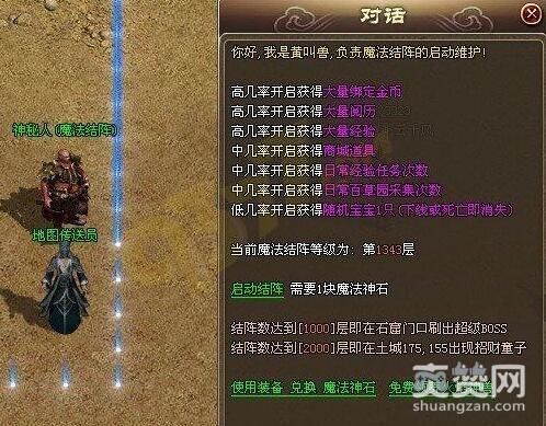 想要开启迷阵,当然还得有钥匙——魔法神石。捐献魔法神石,当前的魔法结阵就会随之增加一层。当结阵数达到1000层时,石窟门口就会刷出超级BOSS,当结阵数达到2000,就会召出招财童子。魔法神石可以通过打怪掉落以及装备兑换的方式获得。