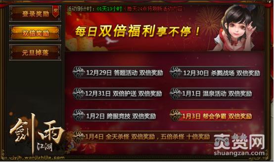 新年好彩头,七天双倍乐翻天!在玩机之家《剑雨江湖》元旦活动期间,每天指定的活动可以获得双倍的奖励哦!我们特意为大侠们准备了答题活动奖励双倍,杀戮战场奖励双倍,全天护送活动双倍,双倍时段四倍,温泉活动经验及奖励双倍,跨服竞技场功勋双倍,帮会争霸奖励双倍和全天杀怪双倍,5倍时段10倍的超爽双倍活动,这简直就是所有大侠们的福音啊!