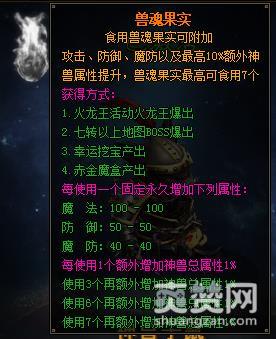 兽魂果实作为合成材料,可合成附灵果实,3个兽魂果实+500W绑金100%合成一颗附灵果实。附灵果实可对装备进行附灵,附灵后增加本职攻击、物理防御、魔法防御这三种属性。