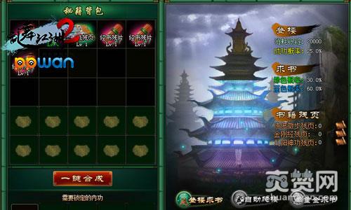 在藏经阁中随着玩家登楼层数的提高,登楼所消耗的银锭也随之增长,不过玩家求取高阶经书(《乱舞江湖2》中经书等阶分为:白、绿、蓝、紫、金)的概率也随之增大!友情提示:求书时获得的内功,直接进入秘籍背包中。若秘籍背包已满,则无法继续求书,每日将有免费求书1次的机会!