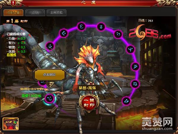 点击游戏界面左下角的“心魔”按钮,可进入心魔系统。在心魔系统中,玩家可对当前的心魔发起挑战,如果挑战胜利则获得封印心魔的资格,如果挑战失败,可以再次挑战直到成功。要彻底打败心魔,需要玩家对心魔进行多层的封印。封印成功后,可挑战下一只心魔。