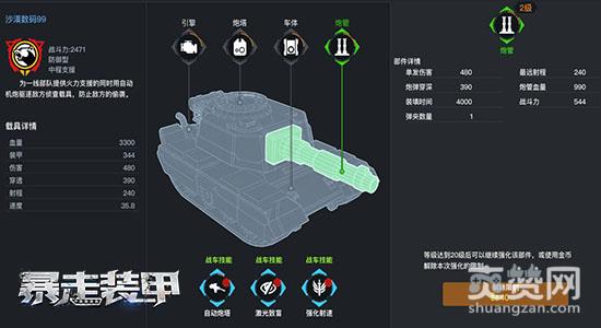 玩家在解锁99式装甲后,可以在强化界面中对其进行部件强化以及技能升级。99装甲共同拥有三个主动技能:自动炮塔、激光致盲、强化射速,在战场中合理运用将会有意想不到的效果。