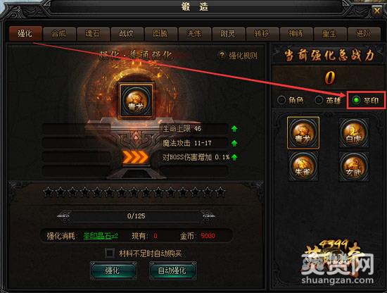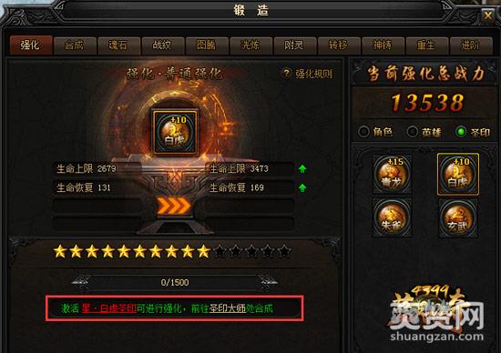 圣印激活后,可在锻造界面强化页,通过消耗“圣印晶石”、“圣印灵石”、“圣印神石”进行强化。
