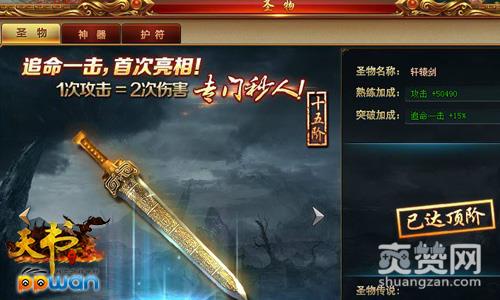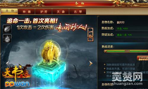 追命一击,专门秒人!ppwan《天书世界》圣物系统作为提升人物战斗力的重要系统之一,包含了圣物、神器、护符、天象和古琴五大玩法,其中圣物1次攻击等于两次伤害,强力暴击你懂得!
