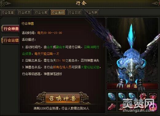 行会还可进行升级,初始为1级,最高可达到10级,升级行会时需要行会资源和成员上限同时达到相应条件才能满足。行会中还有行会神兽和行会运镖玩法,在行会神兽玩法中行会等级越高,神兽掉落就越好。