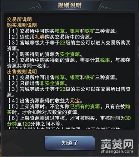 交易所内上架的资源只能是非安全资源,而从交易所购买得到的资源则为安全资源。如果主公备受战乱之苦,就可以通过把自己所拥有的非安全资源上架到交易所,将其换成元宝,以免遭受掠夺。需要提醒各位主公的是,交易所中购买得到的资源需要计算税率,且与掠夺资源共享同一税率,因此主公们要注意合理安排自己的资源购买与资源掠夺的比例哦!