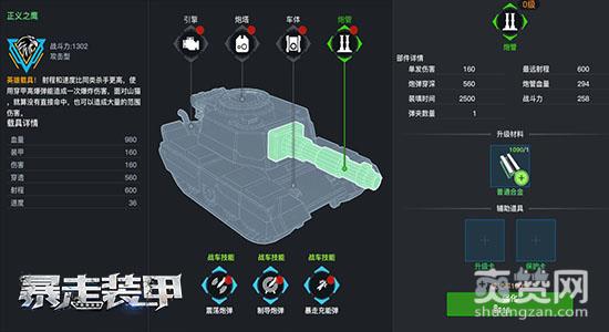 在强化界面中,玩家可以对正义之鹰号装甲的引擎、炮塔、车体、炮管部件进行升级,提升装甲的整体属性。并且还能对其三个主动技能进行升级,使技能获得更大威力。