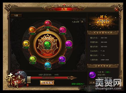 在萝卜玩《赤月传说2》中,服务器开服三十天,玩家心法等级达到30级即可激活九宫系统。九宫主要提升玩家的攻击、物防、魔防、生命值、魔防值和特殊属性元素防御,可以说是六合一增强系统了。