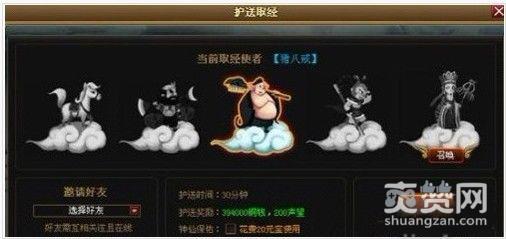 游戏中玩家每天有3次机会选择护送取经。每次玩家都可以选择需要护送的人物,不同的人物最终奖励也会不同,奖励由高到低的人物排名依次是唐僧、悟空、猪八戒、沙和尚以及小白马,当然,选择人物是需要用元宝刷滴。如果你幸福的刷到到了唐僧,那么百万铜币和丰厚的声望就将在终点中等着你!此外为了增加游戏的互动与乐趣,玩家还将拥有4次打劫其他玩家取经的机会,如果打劫成功,也会获得一定奖励哦。所以,如果你护送的人物比较‘值钱’,而你的实力又不是很强的话,最好邀请一个强大的朋友帮你护经。