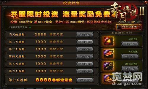 在萝卜玩《赤月传说2》新服前3天,系统会启动限时的投资计划玩法。玩家在游戏中投资8888元宝可在7天内返还8888元宝及8888绑元,这么清晰的白送真的好吗???另外根据玩家达到一定等级,还可额外获得等级返利礼包哦!各种大礼包等你来领取,千万不要错过啊!