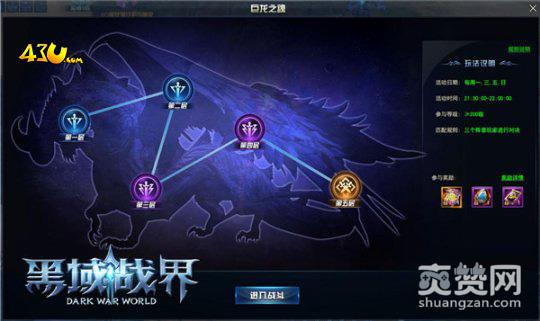 43u《黑域战界》中玩家们等级达到200级时即可参与巨龙之魂挑战,该玩法将于每周一、三、五、七晚21:30—22:00开启,届时,玩家还可以和本服玩家在同一阵营进行屠龙之战。