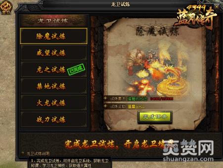 玩家可根据要求完成各项试炼,只有通过全部试炼方可开启龙卫系统,获取龙卫之威!
