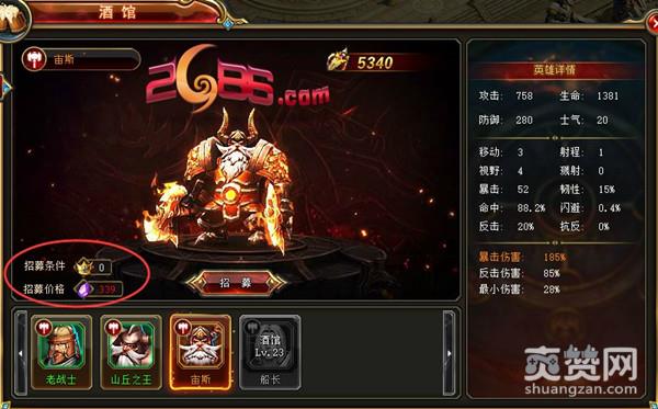 宙斯是酒馆中第一个橙色英雄,在酒馆15级时解锁招募方式。因为是游戏中顶级的英雄之一,所以宙斯的招募方法也和普通英雄不同。在招募宙斯时,玩家只会消耗钻石,而不会消耗威望和金币。招募宙斯需要消耗339钻石,钻石可以通过战役通关或充值获得。