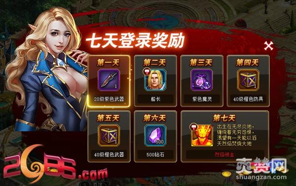 新手登录游戏即可领取到超值道具奖励。第一天奖励是20级紫色武器,第二天是蓝色英雄,第三天是紫色魔灵……第七天是金色英雄“烈焰领主”。连续七天,每天登录都有超值奖励。玩家可以利用这七天奖励来强化自己的前期队伍,快速打造一支强大的远征队伍。