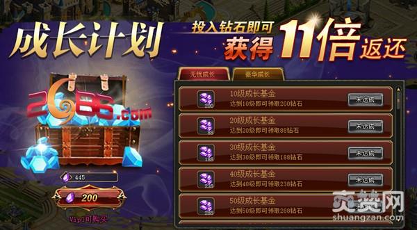 成长计划是游戏推出的钻石投资活动。在这个活动中,玩家使用钻石进行投资可获得11倍返利。玩家投入的钻石越多,最终的收益就越丰厚。投资收益分8个阶段返还,当玩家达到指定等级时,就可以领取对应阶段的钻石。