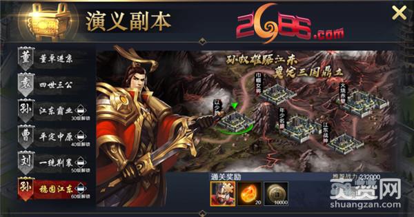 演义副本以时间为主线设计章节的特殊武将副本。在这个副本中,主公需要依次挑战六个势力的敌人,这六个势力分别是董卓势力、袁绍势力、孙坚势力、曹操势力、刘备势力和孙权势力,挑战获胜可以得到对应势力的名将碎片、若干将魂和少量铜钱。主公完整打完一个章节后,就可以夺取到名将。