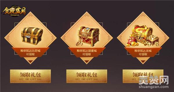 护卫粮草前行从新手村出发,当护卫粮草到比奇城、盟重城、龙城,可以分别领取大礼包1份,快来参与活动吧!