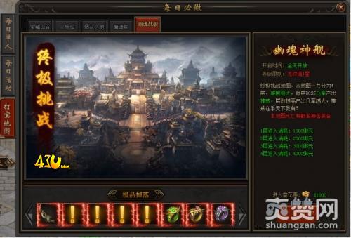 遍布超级BOSS的幽魂神舰,是终极挑战地图,也是全服唯一有几率掉落神戒的地图。地图一共分为4层,里边的BOSS及其变态,击杀之后有几率掉落16阶红色品质武器王者之刃、16阶红色品质乱世套装以及各种神戒,层数越高,BOSS越强,神戒掉落几率越大。