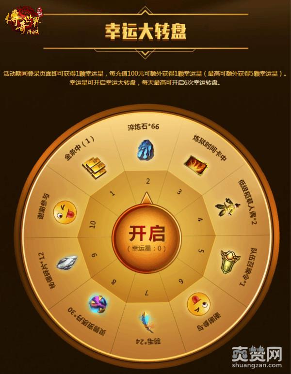 3月21日-27日活动期间,登录页面即可获得1颗幸运星,每充值100元可额外获得1颗幸运星(最高可额外获得5颗幸运星),幸运星可开启幸运大转盘,每天最高可开启6次幸运转盘。