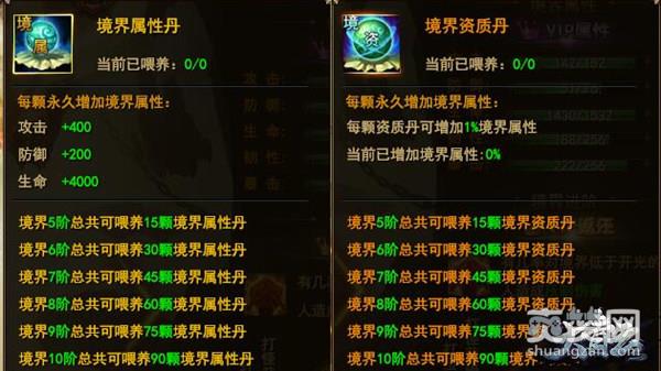 想要永久性提升境界属性,需要境界属性丹和境界资质丹的辅助。境界属性丹可以永久增加角色的攻击、防御和生命,境界资质丹则是服用后每颗可增加1%境界属性。新服开服7天中会有境界为主题的活动,参与活动即可获得境界属性丹和境界资质丹。但丹药也不是一劳永逸,它也有上限,在境界达到5阶后每一阶都会限制服用丹药的颗数,尽管丹药可以大幅提升战斗力,但还是要把控好度啊!