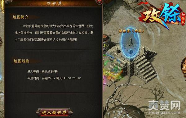 不知什么时候,当我们登录《攻铩》来到热砂荒漠,便可以在主城安全区旁边的高台上窥见一个蓝色的光球传送门。光球之上明确的写着“新世界”字样,新世界是什么?新世界在哪里?想知道吗?如果你想,那么就请先达到6转,并在下午两点半之后晚上8点之前来到这里,亲自一探究竟!