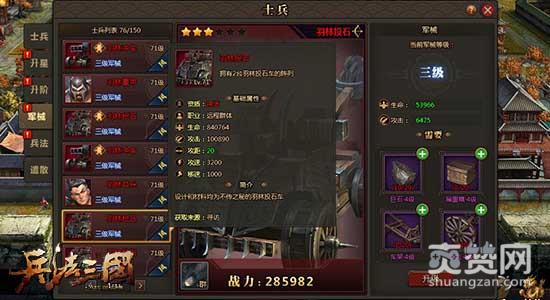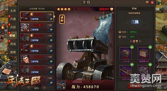 在腾讯《兵法三国》的士兵系统中,打开军械界面即可查看所有士兵目前的军械等级,以及军械属性。不同士兵所需要的军械部件也不一样,使用四种对应的军械部件即可为士兵军械升级。