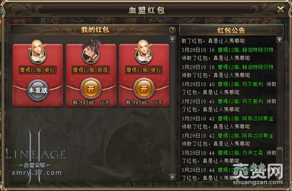 进入血盟红包后,可以在“我的红包”中查看现有红包,点击“开”即可领取。红包为拼手气形式,拿到多少全凭运气。