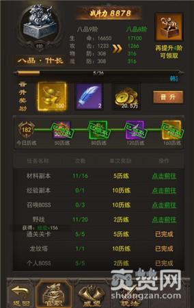 提升官职只需完成游戏内的所有日常活动,副本,BOSS即可,其中,每天野战需打满20次,材料副本根据自身VIP等级挑战的次数越多,获取的历练点数越多。