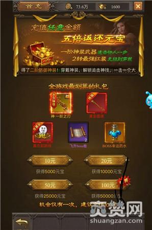 《斩月屠龙》的首充可以说是十分亲民了,玩家在游戏里首次充值,可以获得五倍的返利,一共有四个档次可以选择,分别是10元,20元,50元和100元,首充有5倍返利的机会只有一次,也就是说,如果你充值的是100元,那么实际到账是50000元宝,所以第一次充值建议还是充个100块钱比较划算。
