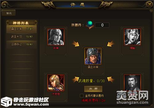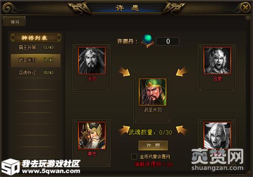 等主公集齐4位开启武将后,许愿才能开始进行。如果4位开启武将中差了哪一位,则即便有足够许愿丹也是不行的。主公每次许愿都会消耗20枚许愿丹,1枚许愿丹价值100金币。如果许愿丹不足,主公也可以用金币来代替,完成许愿。