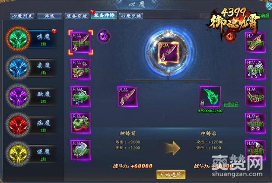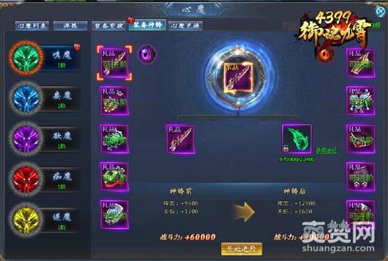通过心魔兑换商店消耗积分类道具换取对应的心魔装备进行进阶突破,积分通过心魔boss产出,攻击和防御类装备进阶到一定等级会激活共鸣属性。