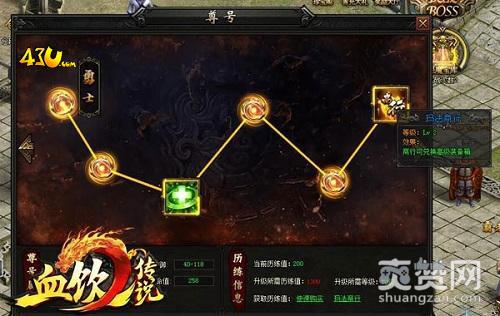 43u《血饮传说》游戏玛法商行刷出高转装备,不是因为玩家充了多少钱,也不是因为玩家的VIP等级多少或者买了什么特权卡之类的,而是因为“尊号”系统。大家仔细看下,在勇士级别的尊号的最后一格,有商行字样,看介绍即商行可兑换高级装备箱。也就是说大家只要把尊号的这一格点亮,就可以在商行里刷到高级装备箱子了!