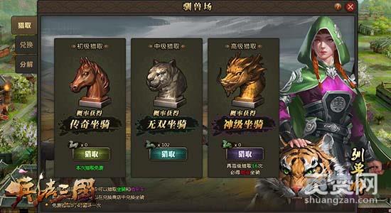 在腾讯《兵法三国》的内城东部,可以找到驯兽场的入口。驯兽场中包括猎取、兑换、分解三个种功能玩法。玩家可以在驯兽场中猎取各种武将专属坐骑,以提升武将的能力。