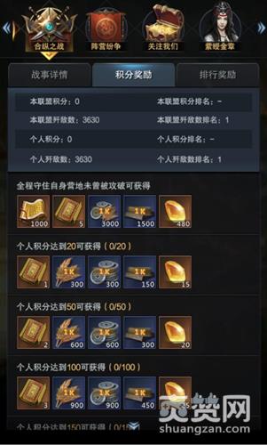 每个主公的营地初始积分将根据当时的战力来评定,攻破其他主公的营地可以夺取悬赏积分,夺取的积分会加到己方阵营的阵营积分上,同时会增加其20%的积分到自身的悬赏积分。活动结束时积分多的一方获胜,如果其中一个阵营获取对方积分达到总积分48%,活动将提前结束。合纵之战作为一个要塞攻防战,援防、进攻都只能在营地中进行。而且,即使是同盟,只要处在敌对阵营,都不能参与集结和援防。