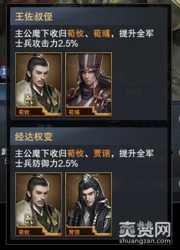 首先从五维属性上看,荀攸作为一名智力将,其智力值达到了97,仅次于郭嘉和诸葛亮,在智力将中名列前茅。从缘分搭配上看,荀攸不仅可以和荀彧组成“王佐叔侄”的缘分组合,提升全军攻击力2.5%;还可以和贾诩组成“经达权变”的缘分组合,提升全军防御力2.5%。这两种缘分组合对于主公们来说都是提升军团实力的极大助力。