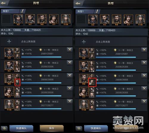 再来看荀攸的技能。他的“飞弩”技能可以提高15%弓兵的攻击力,这一技能的强度和周瑜的“火矢”一样,并且比“无双弓”的效果还要强5%。而荀攸的厉害之处更是在于他的二技能“谋主”,这一技能能提高所在军团智将攻防加成40%。从图中可以看到,在军团带步兵的情况下,因为贾诩和荀攸智力相等,把贾诩换成荀攸,影响军团攻防加成的只有荀攸的“谋主”技能,此时每个部队的攻防都增加了12%左右。这个加成虽然跟军团参谋的智力有关,但也相差不大。这也就可以看做荀攸直接带了一个加强版的“空城”和“无双”技能,可以说是非常强势的一位武将了。