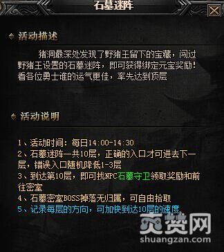 923yx《霸王之心》的猪洞最深处发现了野猪王留下的宝藏,若能闯过野猪王设置的石墓迷阵,即可获得绑定元宝奖励!只要大家等级达到68级,即可在每天的14:00-14:30前往盟重土城寻找NPC“屠诸”对话进入石墓迷阵。