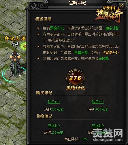 “黑暗印记”可通过位于玛法密境的NPC印记大师“龙战”(107,90)消耗元宝购买。“黑暗印记”还可兑换成元宝,每日兑换有次数限制