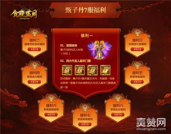《贪玩蓝月》甄子丹7区开服当天最先创建角色的10名玩家赠送首充1000元宝,还有两大甄子丹专区特有福利!甄子丹7服开服五天内,充值第一玩家会获得一套甄子丹时装和四大代言人副本门票挑战券各一张!同时,甄子丹还会化身为福利官随机抽取20名70级以上的玩家赠送12666元宝。在开服前5天,战力、等级、英雄、翅膀分别排名前10的玩家都可以获得最高50000元宝的奖励!