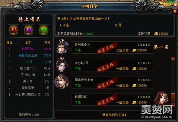 在萝卜玩《大明征途》中,大明科举活动是一个特色的答题活动,于每天的12:05准时开启。在活动中,玩家参与答题即可获得铜钱奖励,答题的速度越快,正确率越高,获得的积分也就越高。选错答案以后,还可以等两秒冷却时间选择别的答案重新回答。