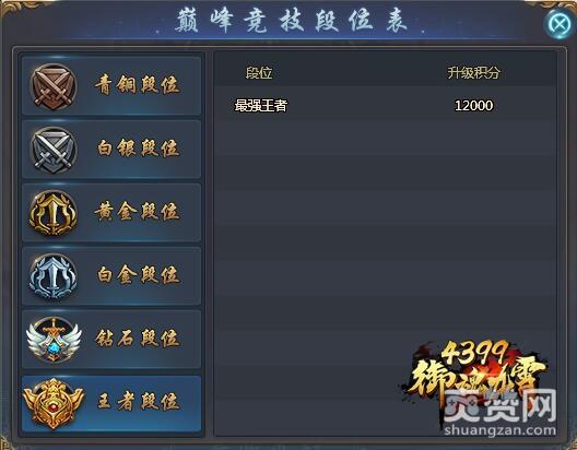 巅峰竞技的段位从低到高为青铜、白银、黄金、白金、钻石和王者。达到一定的积分即可进入对应的段位,例如最强王者段位的升级积分为12000。