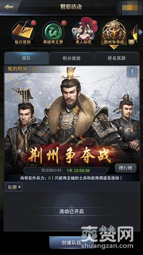 荆州争夺战,和官渡之战同样,都是通过建筑争夺战抢夺积分的模式来进行的。进场流程首先是需要创建队伍,5人为一队,组满其他4个队友才能进入战场,在未满5人的时候点击匹配则会由系统自动搜索本区其他玩家进行匹配。而荆州争夺战与官渡之战最大的区别在于,荆州争夺战是三方势力进行的混战模式,这样就为整场战斗增添了许多变数,其中一方的优势大了就会受到另外两方的围攻,这就需要考验各方势力能不能根据战局形势培养良好的临场默契去进行联合攻打。