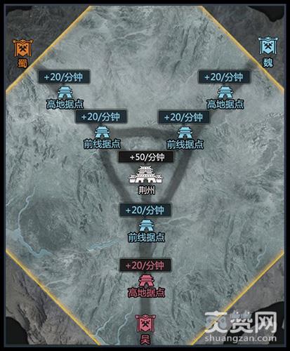 由于是三方混战,荆州争夺战的地图也是别具特色的。地图上的建筑呈三角形分布,中间为荆州,荆州和三方大营之间存在前线据点和高地据点,三个前线据点和荆州是属于互连建筑。大营属于不可攻打建筑,而在攻打其他营地的高地据点前需要先攻下其前线据点。攻击规则是只能攻击连成一线的建筑,并且获得荆州积分有一个前提条件,那就是荆州必须能和大营连成一线,也就是拿到荆州的一方必须同时死守自己的前线,否则即使占据荆州也是没用的。所以没抢到荆州的另外两方也不用灰心,首要任务就是截断对方前线,也是有机会能扭转战局的。