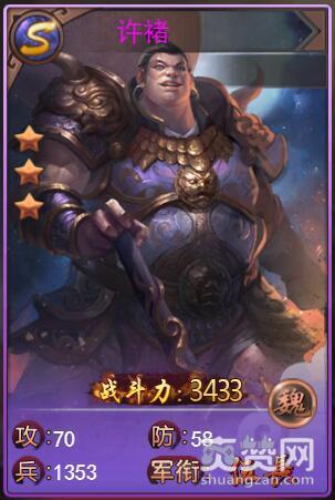 许褚属于肉盾型选手,有肉能控,作为前排比较给力,进入战斗后加全体武将攻速15秒,相当于加输出。再说搭配,许褚最大问题就是输出略显不足,所以前期可搭配马超、关羽、姜维,中期搭配张飞、姜维、太史慈,后期搭配曹操、张飞、太史慈、貂蝉。由于许褚1天赋后,可以直接冲到敌方前排进行控制+抗伤害,并对友军提升输出加成,后排配合一些高dps的武将可以受益最大化。