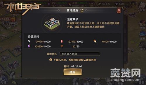 当玩家成功占领了土地之后,即可消耗一定数量的资源在该土地上建造营地并命名,玩家部队向营地移动时移动消耗时间为正常时间的三分之一。玩家可通过升级营地科技中的不同技能,来对营地进行升级,如缩短营地建造时间、提高营地可驻扎部队数量上限和营地耐久度等。同时玩家也可消耗“现金”资源在营地内进行征兵。此外,当营地耐久度为零时,营地被摧毁,各位玩家可要注意保护营地安全噢~