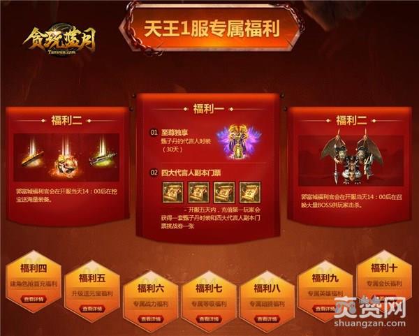 《贪玩蓝月》天王传奇服首服,当天最先创建角色的10名玩家赠送首充1000元宝,还有3大天王服首服特有福利!天王传奇服首服开服五天内,充值第一玩家会获得一套甄子丹时装和四大代言人副本门票挑战券各一张!在开服当天14:00后在召唤大量BOSS供玩家击杀,并挖宝送海量装备!