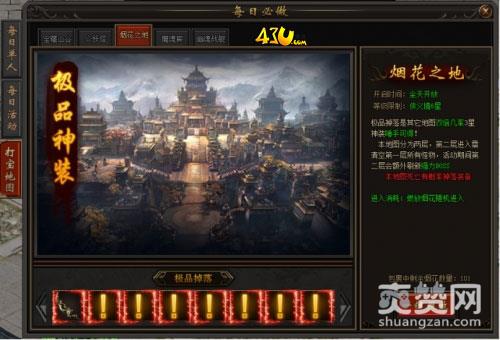 神秘的烟花之地盛产极品神装,极品掉落几率是其它地图的双倍。地图一共分为两层,想要进入第二层,就需要清空第一层所有怪物。第二层东、南、西、北由四只神兽镇守,击杀四只神兽之后,地图中间才会刷新超级BOSS,击杀BOSS有几率掉落16阶红色品质武器王者之刃和16阶红色品质乱世套装。都是难得的宝物,小伙伴们加油往前冲鸭!